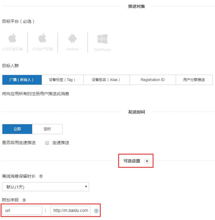 如果你使用极光平台Web端发送通知,请点击进入你创建的应用 - 推送 - 发送通知,展开 可选设置 - 附加字段![]()