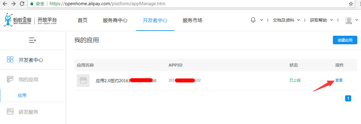 2. 进入 开发者中心 - 我的应用, 点击直接进入 https://openhome.alipay.com/platform/appManage.htm
