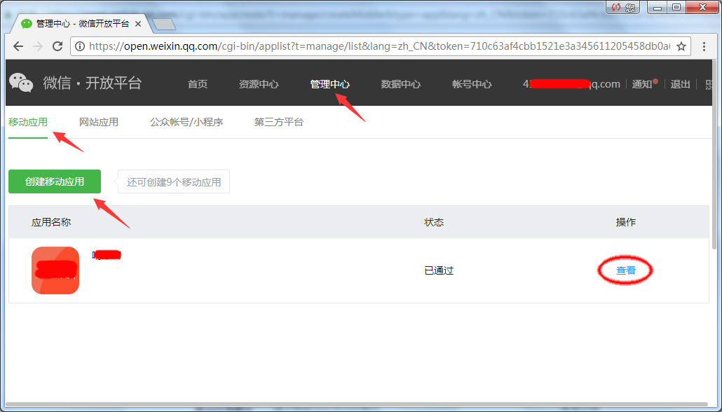 3. 点击 管理中心 - 移动应用 - 创建移动应用,按要求提交资料供腾讯审核。